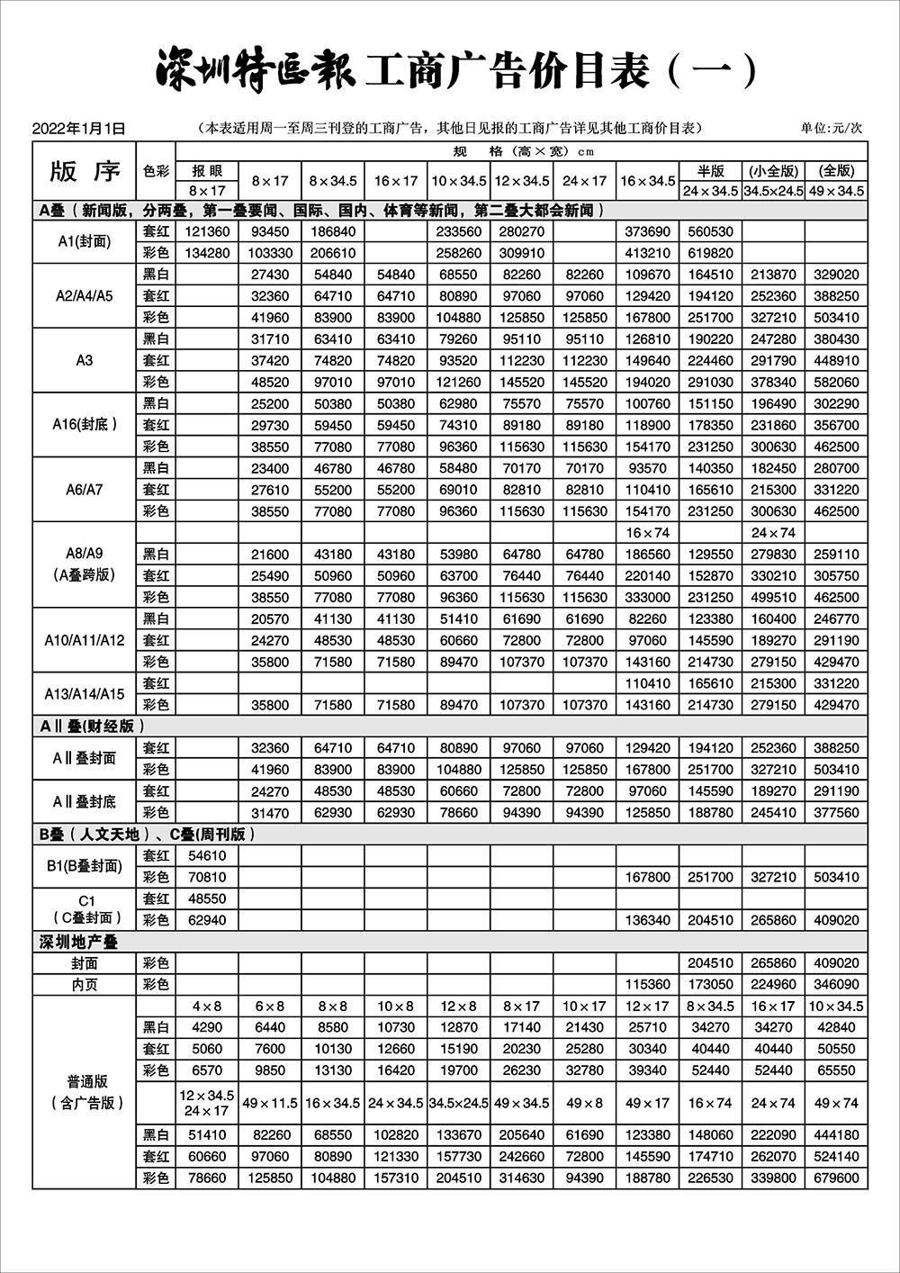 深圳特區(qū)報(bào)工商廣告價(jià)目表