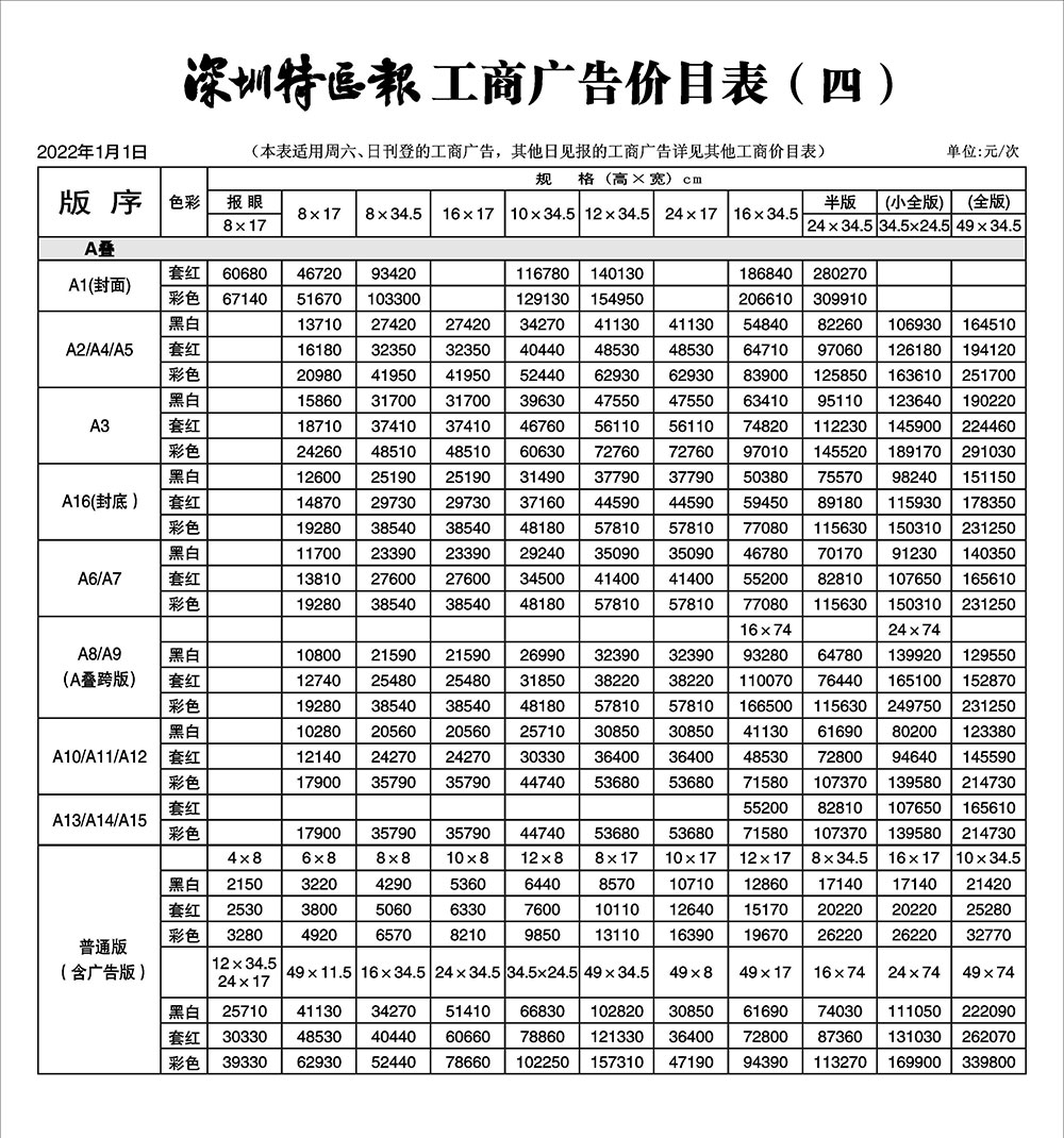 深圳特區(qū)報工商廣告價目表