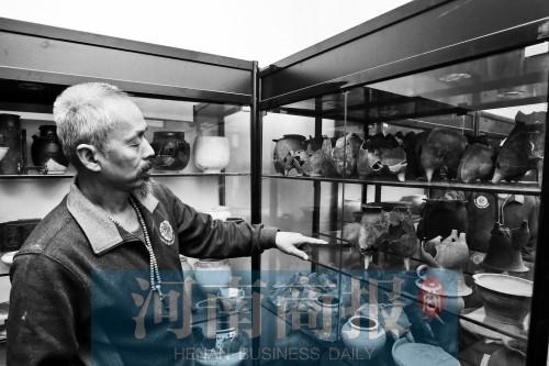 “這個(gè)是商代的鬲,這個(gè)是漢代的陶,這個(gè)是五代時(shí)期的玉枕……”河南鄭州某小區(qū),在59歲敬勤儉的家中,說起展示柜中的藏品,他一臉的寵溺?!捌林亍薄昂每吹煤堋笔撬f到這些寶貝時(shí)用得最多的話,這些都是敬勤儉在近20年里撿來的。