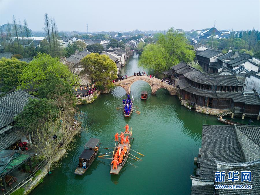 3月29日,烏鎮(zhèn)水鄉(xiāng)百姓在烏鎮(zhèn)西柵景區(qū)參加名為“踏白船”的傳統(tǒng)水上競技活動,吸引游客前來感受水鄉(xiāng)獨特的民俗風情?!疤ぐ状备傎惖哪康氖菫榱似砬笮Q桑豐收。