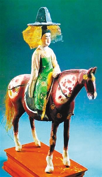 但細(xì)看這幅圖,所謂“羃”只是在寬檐帽下垂有帶狀物,不足以將全身遮蔽,很難說真的就是“羃”。因此關(guān)于“羃”的形制,還有待文物資料的繼續(xù)發(fā)現(xiàn)?!傲]”之外,“帷帽”的形制又是如何?從上面的介紹可知,帷帽的特點(diǎn)是“拖裙到頸,漸為淺露”。從這一點(diǎn)出發(fā),1972年新疆吐魯番唐墓出土的“彩繪騎馬仕女泥俑”,有人認(rèn)為所戴就是帷帽。