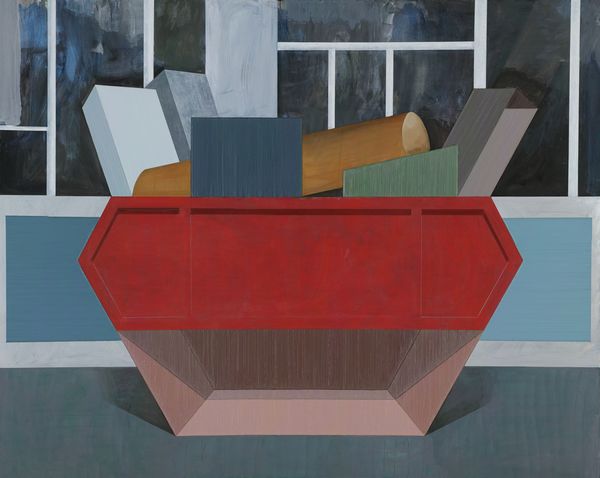 趙新宇作品當(dāng)中的圖式來源,無論是從攝影作品中或者裝置作品中抑或現(xiàn)實(shí)當(dāng)中選取某個(gè)場(chǎng)景的邊角,從某種程度上,均服從于他個(gè)人基于謹(jǐn)慎的、甚至敏感的內(nèi)在壓制,正如《室外2#容器》背景的窗框,稱其為窗框,倒不如把它當(dāng)作畫面整體結(jié)構(gòu)的一個(gè)同級(jí)邏輯走向,正如同置放在背景前的所謂“容器”當(dāng)中的幾何體,是幾何化了的現(xiàn)實(shí)物與根據(jù)畫面再行部分添加的合奏,在某種程度上,也可以說是塞尚繪畫理念的一則變異體。