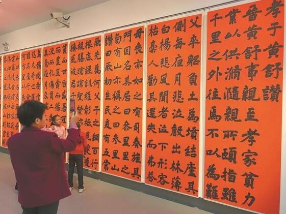 據(jù)了解,此次展覽不同于普通的書法展,而是以“孝德”為內(nèi)容的主題創(chuàng)作展,所有作品都圍繞孝文化進行創(chuàng)作,每一幅作品都在講述一個關于孝文化的故事。在“孝德”大主題下,又分了幾個小專題,比如“二十四孝專題”“孝經(jīng)專題”“金石題跋專題”,還有本土的“孝德寶安專題”。當天的展覽吸引了大量觀眾,不少觀眾還帶著小孩參觀,黃女士告訴記者,“今天帶著小孩來,一是欣賞書法,二是希望小孩了解一下傳統(tǒng)的孝德文化,我們通過書法還了解到寶安孝子黃舒的故事?!?/p>