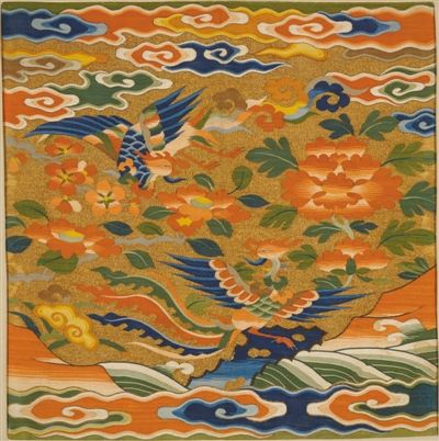 鸞鳳與牡丹、湖石、祥云相配稱“鳳穿牡丹”或“鳳戲(喜)牡丹”,佳節(jié)初歲時(shí)寓意四季平安、富貴吉祥。而成對(duì)出現(xiàn)的鳳凰與花卉又有贊頌夫婦恩愛(ài)、富貴白頭之意?,F(xiàn)藏美國(guó)大都會(huì)博物館的明人緙絲鳳穿牡丹方補(bǔ)原綴明代內(nèi)命婦吉服,穿用于慶典朝會(huì)。方補(bǔ)中一對(duì)緙絲彩鳳被安置在山花樹(shù)石佳景之中,叢生的靈芝、山茶、梅花、牡丹皆有吉祥寓意。這樣題材的緙絲補(bǔ)子亦見(jiàn)清華大學(xué)藝術(shù)館藏,可見(jiàn)在明代使用富有節(jié)慶特色的補(bǔ)子頗為常見(jiàn)。