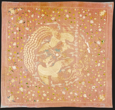 明清時(shí)期,羽翼華麗的鳳凰從遙遠(yuǎn)的天上下降凡間,將一切美好灑向人間,這一時(shí)期織物上常見(jiàn)以纏枝花卉紋樣搭配鸞鳳、對(duì)鳳之裝飾手法,或配上菊花、蓮花、牡丹等人們喜聞樂(lè)見(jiàn)的四季平安花卉,鳳穿牡丹、鳳踏蓮花、龍鳳翔云等等吉祥紋樣以寫實(shí)手法細(xì)膩的表現(xiàn),無(wú)疑體現(xiàn)古人的思想和審美。