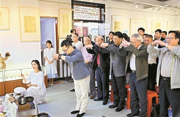 絲竹管弦伴著《詩經(jīng)》吟誦,古雅之風(fēng)貫穿了古今。當(dāng)天除了慕雅思古之外,亦有崇賢。參加活動的眾人,向書圣王羲之的畫像作揖、致敬。羅烈杰、盧紹武、李靜現(xiàn)場做了熱情洋溢的講話,他們鼓勵書界同仁要團(tuán)結(jié)努力,既要繼承傳統(tǒng)、又要推陳出新,不斷弘揚(yáng)中華民族的優(yōu)秀文化。禮畢后,著名古琴家高建國現(xiàn)場操琴。除此之外,還有精彩的茶藝、二胡表演等等。
