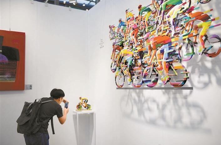 參展商“譽(yù)美國(guó)際”的展臺(tái)外墻上,一場(chǎng)疾馳中的跑馬比賽正酣。將不銹鋼板切片組合,飾以熱情而愉悅的色彩,這兩組風(fēng)格極具個(gè)性化的墻面雕塑作品,均來(lái)自以色列國(guó)寶級(jí)藝術(shù)家大衛(wèi)·格斯坦,引得不少觀眾駐足欣賞。