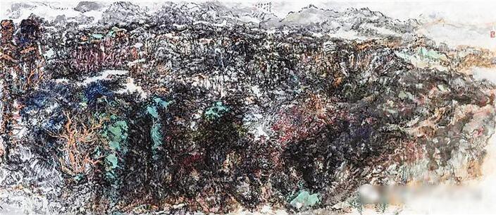 本次畫展題為“妙合化權(quán)”,出自宋代黃修復(fù)《益州名畫錄》:“大凡畫藝,應(yīng)物象形,其天機迥高,思與神合,創(chuàng)意立體,妙合化權(quán)。”意即神思與物象相協(xié)調(diào),主觀創(chuàng)造與自然物象的妙合無礙,便能筆顯通神,創(chuàng)意無限,這也是中國畫家們追求的至高境界。孫克說,中國畫講究“外師造化,中得心源”?!皫煼ㄗ匀弧笔钱嫾异`感源泉,也促使中國畫藝術(shù)源遠流長,無窮無盡。李照東的新作墨彩繽紛,視覺張力恣肆磅礴,而畫面之中,溪谷幽深,流水潺湲,屋宇聚散,情趣盎然,足見畫家深得“造境”之妙。