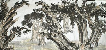 另一個他擅長的題材是古柏樹。1992年他去泰山采風途中。山上的古柏樹生機勃發(fā),堅韌不拔,給他帶來了一種震撼的力量。他當時就想將這些古柏入畫,為古柏注入精神意義。從此,在孔府、孔林、古蜀道以及陜西等地都留下他觀察古柏的足跡。有評論家認為,他的藝術作品不但在整體的構圖上自然、清新和潤朗。而且在整體的布局上,疏密相間,虛實相融,用獨有藝術感覺構建出了一個既蘊含了詩情畫意,又張揚了文化魅力和內心情感的藝術空間。