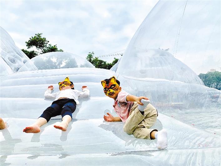在本屆鳳凰花嘉年華主會(huì)場——華僑城體育文化中心綠地空曠自然的草坪上,由本土新銳建筑設(shè)計(jì)師黃澤林設(shè)計(jì)和創(chuàng)作的巨型充氣建筑“空氣山”拔地而起。人們可以自由地在“空氣山”的多維表面上嘗試坐、臥、立、躺的體驗(yàn)。而張凱琴、張齊努、劉小青三位國內(nèi)知名自然藝術(shù)家即興創(chuàng)作的“歇腳云”等自然裝置,通過空間藝術(shù)作品與公眾的互動(dòng),喚醒著人們對自然的熱愛。