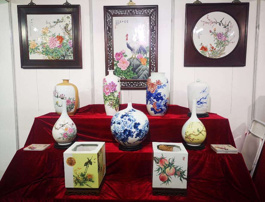 江西省陶瓷技能大師、江西省高級工藝美術(shù)師、惲派花鳥第十二代傳人、景德鎮(zhèn)青年陶瓷藝術(shù)家劉嘉鴻此次展會(huì)展出的陶瓷藝術(shù)作品共計(jì)35件,包含瓷板畫、瓷瓶、瓷盤、青花瓷、青花斗彩瓷等,其中《春滿園》、《錦堂富貴》、《長壽圖》等作品呈現(xiàn)陶瓷技藝,展示出劉嘉鴻深厚的藝術(shù)造詣。
