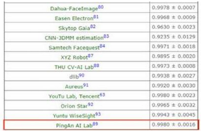 5月9日,國際權(quán)威人臉識別數(shù)據(jù)庫LFW(Labeled Faces in the Wild)最新公布的測試結(jié)果顯示,平安集團旗下平安科技的人臉識別技術(shù)以99.8%的識別精度和最低的波動幅度領(lǐng)先國內(nèi)外知名公司,位居世界第一。該精度為LFW所公布的最佳成績,也是平安科技人工智能實驗室取得的里程碑式成果。此外,經(jīng)國家公安部第三研究所認證中心權(quán)威認證,平安科技人臉識別技術(shù)同樣獲得識別精度99.84%的檢測結(jié)果,并榮獲檢測報告證書。