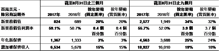 友邦保險三季度主要財務概要