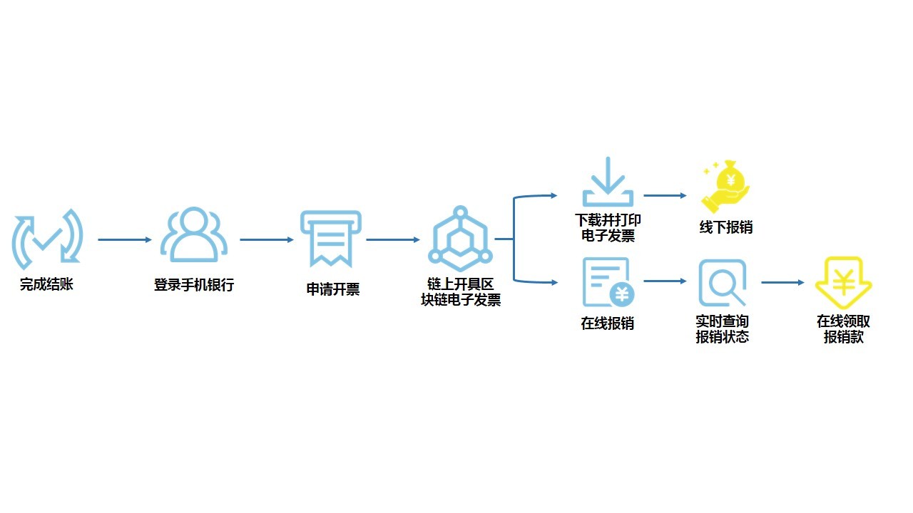 完成試運行階段后,招商銀行客戶在結賬后即可通過手機自助申請開票和一鍵報銷,發(fā)票信息將實時同步至企業(yè)和稅務機關,平臺支持線上領取報銷款,報銷狀態(tài)實時查詢。