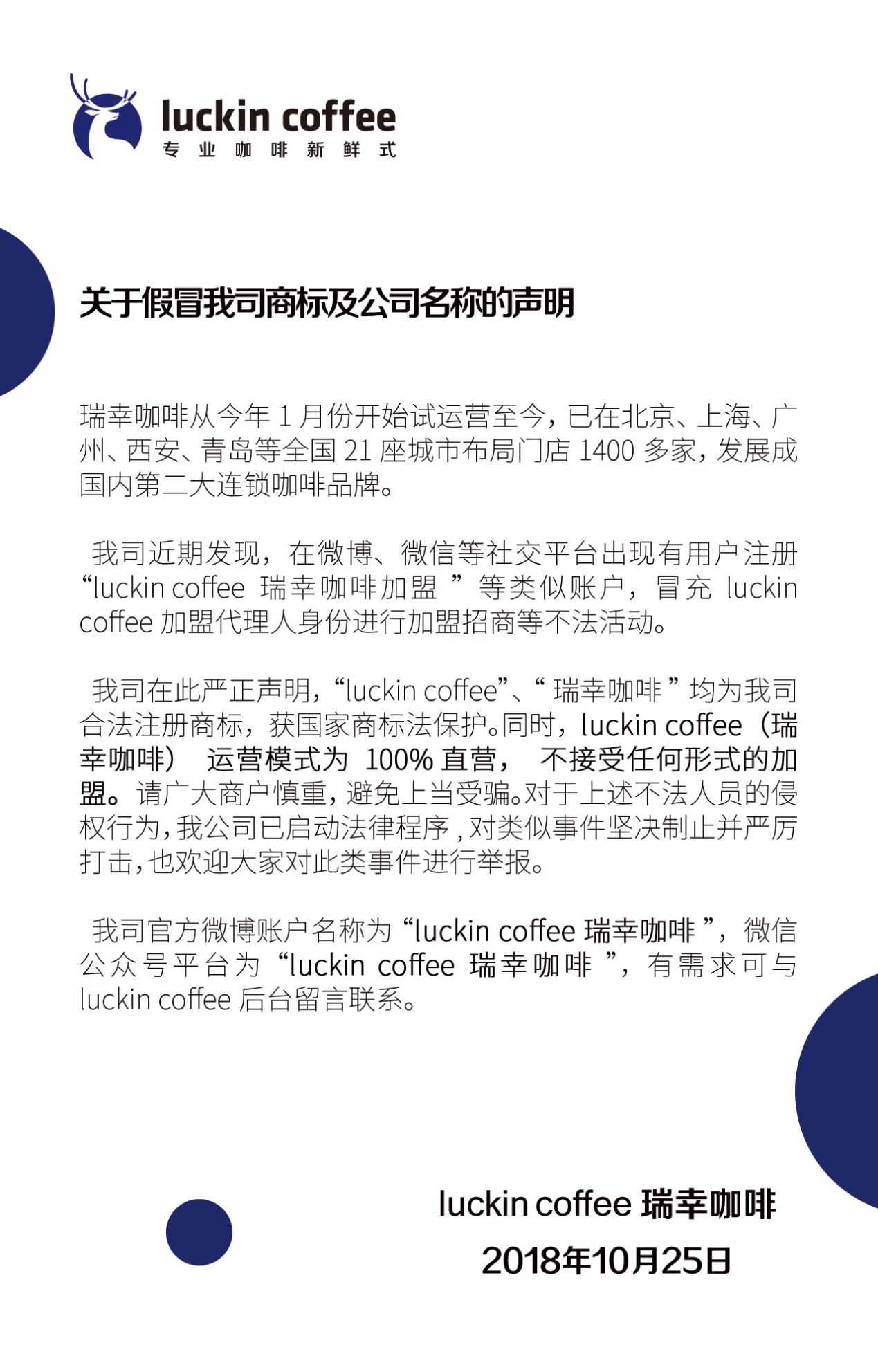 深圳新聞網(wǎng)訊 近日,瑞幸咖啡官宣聲明:我司近期發(fā)現(xiàn),在微博、微信等社交平臺(tái)出現(xiàn)有用戶注冊“l(fā)uckin coffee瑞幸咖啡加盟”等類似賬戶,冒充luckin coffee加盟代理人身份進(jìn)行加盟招商等不法活動(dòng)。luckin coffee瑞幸咖啡堅(jiān)持運(yùn)營模式為100%直營,不接受任何形式的加盟,請廣大商戶慎重,避免上當(dāng)受騙。