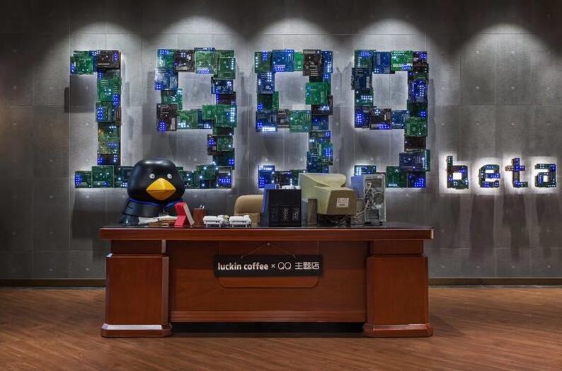 瑞幸咖啡騰訊QQ主題店距離騰訊全球總部所在地濱海大廈不到兩公里??Х鹊瓿錆M互聯(lián)網(wǎng)懷舊特色,擺放著騰訊20年前創(chuàng)業(yè)伊始的第一張辦公桌復(fù)刻版,懷舊打卡的立柱上裝飾有充滿時(shí)代特色的QQ聊天對(duì)話框,在這里還可以聽(tīng)到復(fù)古的QQ提示音。1999年,QQ beta版(測(cè)試版)上線,歷經(jīng)多次迭代目前月活用戶達(dá)8億,成為全球最大的通訊社交平臺(tái)之一。