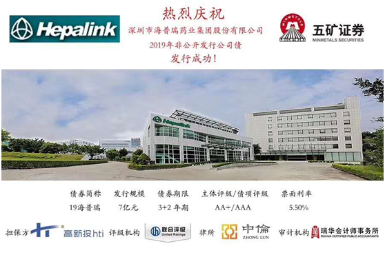 據(jù)悉,此次私募債券“19海普瑞”發(fā)行規(guī)模為7億元,期限3+2年,票面利率5.5%。在深圳高新投的助力下,債券募集過程中,得到了各大金融機構(gòu)的踴躍認購,獲得2倍超額認購額,5.5%的票面利率也創(chuàng)下近期AA+民營企業(yè)發(fā)債利率新低。