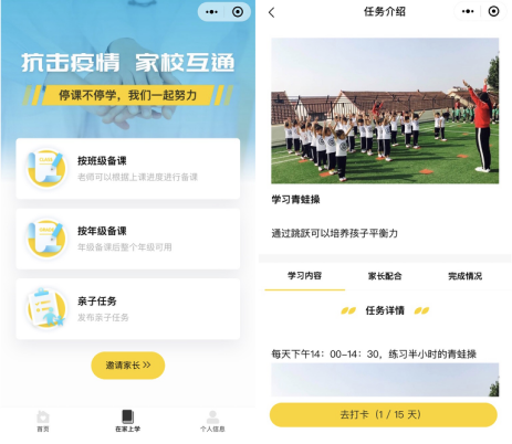 為此,“學(xué)子通”上線了“在家上學(xué)”功能,老師們可根據(jù)實(shí)際需要,選擇“按班級(jí)備課”或“按年級(jí)備課”,針對(duì)班級(jí)或年級(jí)將錄制好的備課內(nèi)容,如防疫小知識(shí)、親子閱讀、親子游戲等內(nèi)容上傳到“在家上學(xué)”模塊,讓孩子“宅”在家中也不停止學(xué)習(xí)的腳步。此外,老師還可通過設(shè)置親子小任務(wù),如一起做青蛙操、讀讀繪本小故事和親子手工藝等,讓家長(zhǎng)和學(xué)生一起參與,并可設(shè)置打卡,調(diào)動(dòng)起學(xué)生的學(xué)習(xí)興趣,既增加親子感情,又讓學(xué)生開展室內(nèi)鍛煉活動(dòng)、開展課外閱讀,保持良好的身體狀態(tài),讓宅在家中的假期生活變得豐富。