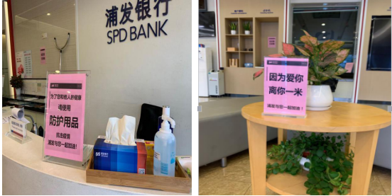 2月10日,在接到浦發(fā)深圳分行統(tǒng)一部署的復(fù)工安排后,科苑支行落實(shí)網(wǎng)點(diǎn)廳堂的各項(xiàng)防疫措施和人員復(fù)工的安全措施,在確保員工和客戶健康安全的前提下,全力保障各項(xiàng)金融服務(wù)需求。走進(jìn)浦發(fā),可以看到廳堂多處區(qū)域配備了口罩、消毒液、一次性手套等防控物資,在廳堂顯眼處設(shè)計(jì)擺放了“因?yàn)閻勰悖x你一米”等暖心提示。其中,黨員同志們帶頭在廳堂進(jìn)行宣傳指引,協(xié)助做好防護(hù)措施。