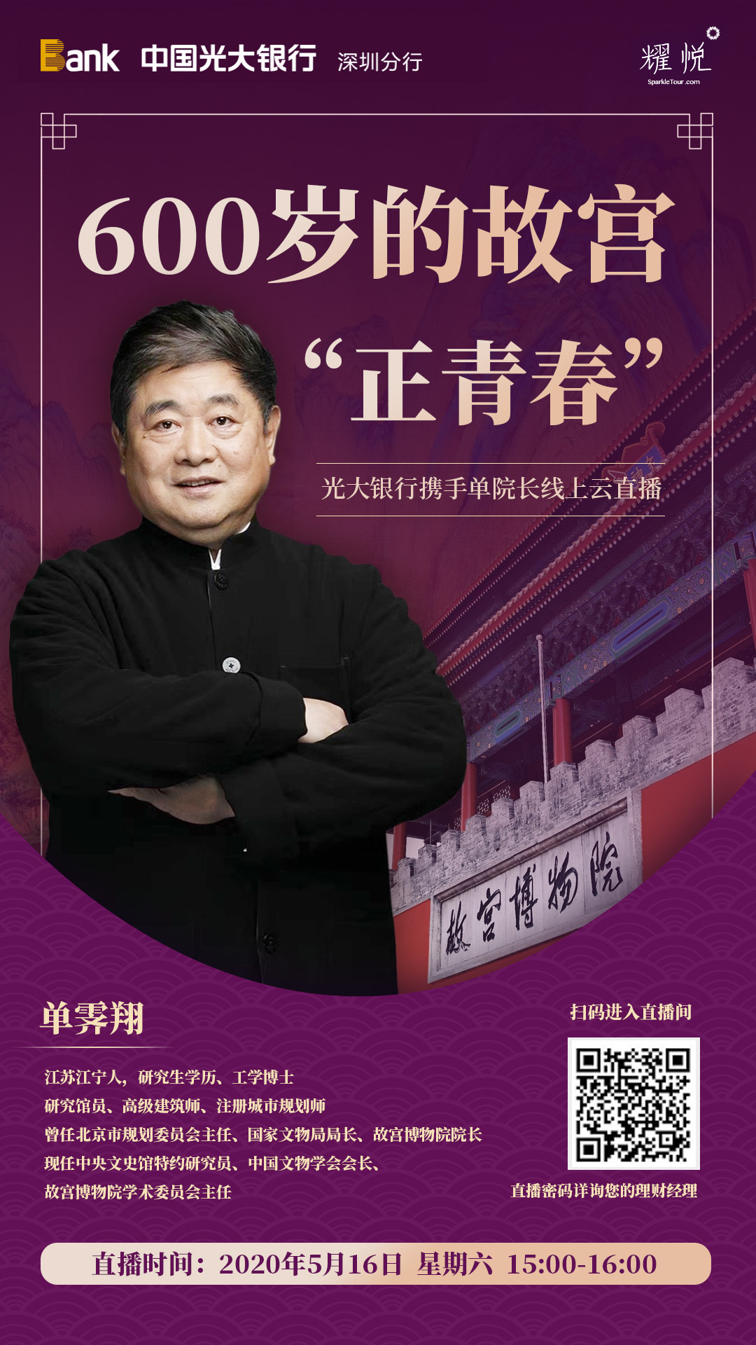 深圳新聞網2020年5月15日訊 他要來了,帶著600歲故宮的青春故事來了,來到《光大銀行“開講啦”!》第十二期。為了回饋客戶,讓廣大客戶更深入體會到故宮之美,光大銀行深圳分行特邀請原故宮博物館單霽翔院長,于5月16日(周六)下午3點-4點線上開講精彩課程《600歲的故宮“正青春”》,讓參與者從多個角度體驗傳統(tǒng)文化之美。