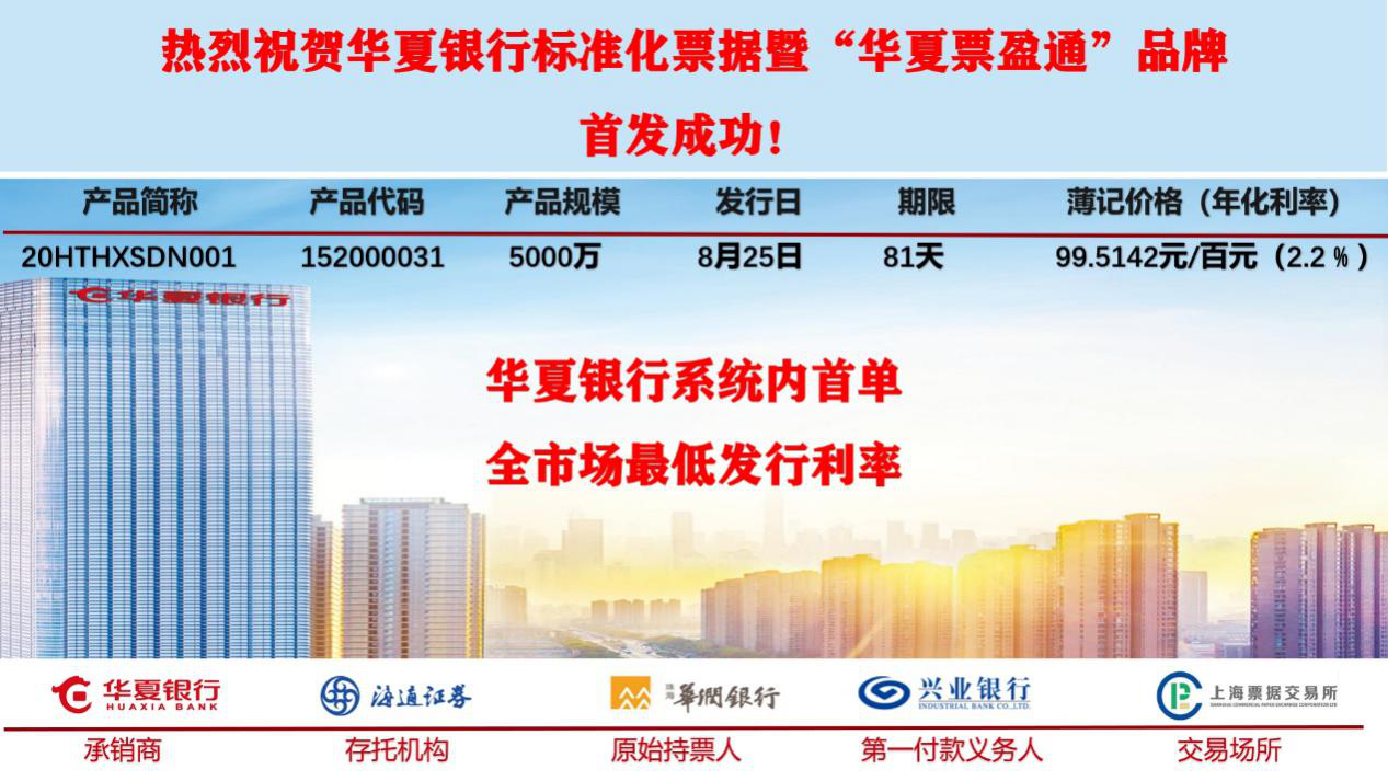 深圳新聞網(wǎng)·見圳客戶端2020年8月25日訊 今日,在深圳特區(qū)成立40周年來臨之際,記者從華夏銀行深圳分行獲悉,由該行承銷的海通證券華夏票盈通2020年度第一期標(biāo)準(zhǔn)化票據(jù)產(chǎn)品(產(chǎn)品簡稱:20HTHXSDN001)在該行系統(tǒng)內(nèi)率先成功發(fā)行。本期標(biāo)準(zhǔn)化票據(jù)發(fā)行規(guī)模5000萬,簿記價格99.5142元/百元面值(相當(dāng)于年化利率2.2%),發(fā)行利率創(chuàng)全市場可比同類型、同期限產(chǎn)品新低,將以更低的融資成本支持“穩(wěn)企業(yè)保就業(yè)”工作。