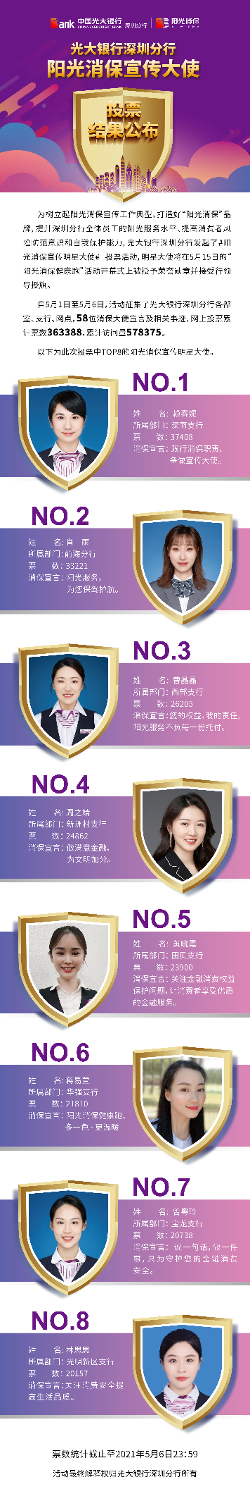 深圳新聞網·見圳客戶端2021年5月8日訊 昨日,光大銀行深圳分行“陽光消保宣傳明星大使”線上投票圓滿結束,從58名宣傳大使中投票產生了賴春妮、肖雨、曹晶晶、周之靖、黃曉霞、蔣易萱、曾粵玲、林思思8名陽光消保宣傳明星大使。明星大使將在5月15日的“陽光消保健康跑”活動開幕式上被授予榮譽勛章并接受行領導授旗。5月1日,光大銀行深圳分行發(fā)起了“陽光消保宣傳明星大使”線上投票,旨在樹立起陽光消保宣傳工作典型,打造“陽光消?!逼放?,提升深圳分行全體員工的陽光服務水平,提高消費者風險防范意識和自我保護能力,提升光大在深圳地區(qū)的品牌影響力。投票活動得到社會熱烈響應,據統(tǒng)計,此次累計票數(shù)達363388次。