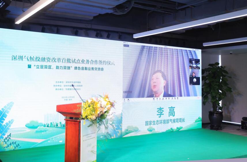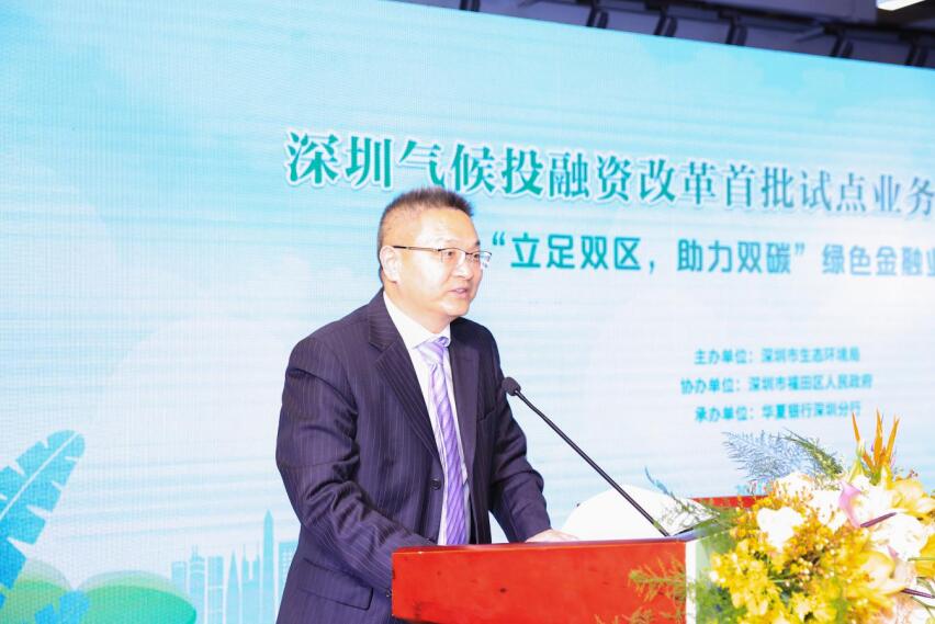 國家生態(tài)環(huán)境部氣候司司長李高,深圳市政府副秘書長劉昂,深圳市生態(tài)環(huán)境局局長李水生,深圳市委改革辦副主任孫華明,福田區(qū)政府副區(qū)長朱江,華夏銀行總行黨委委員、營銷總監(jiān)、深圳分行黨委書記、行長陳傳龍等領(lǐng)導(dǎo)出席。深圳市政府、深圳市生態(tài)環(huán)境局、市委改革辦、中國人民銀行深圳市中心支行、福田區(qū)政府相關(guān)負(fù)責(zé)人、深圳市綠色企業(yè)代表、深圳市綠色相關(guān)行業(yè)協(xié)會代表、華夏銀行深圳分行相關(guān)單位代表等70余人參加活動。
