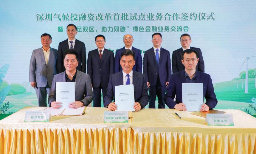 在與會領(lǐng)導(dǎo)嘉賓的共同見證下,華夏銀行深圳分行分別與深圳市創(chuàng)維光伏科技有限公司、深圳市拓日新能源科技股份有限公司簽署了《深圳氣候投融資改革首批試點(diǎn)業(yè)務(wù)合作協(xié)議》。