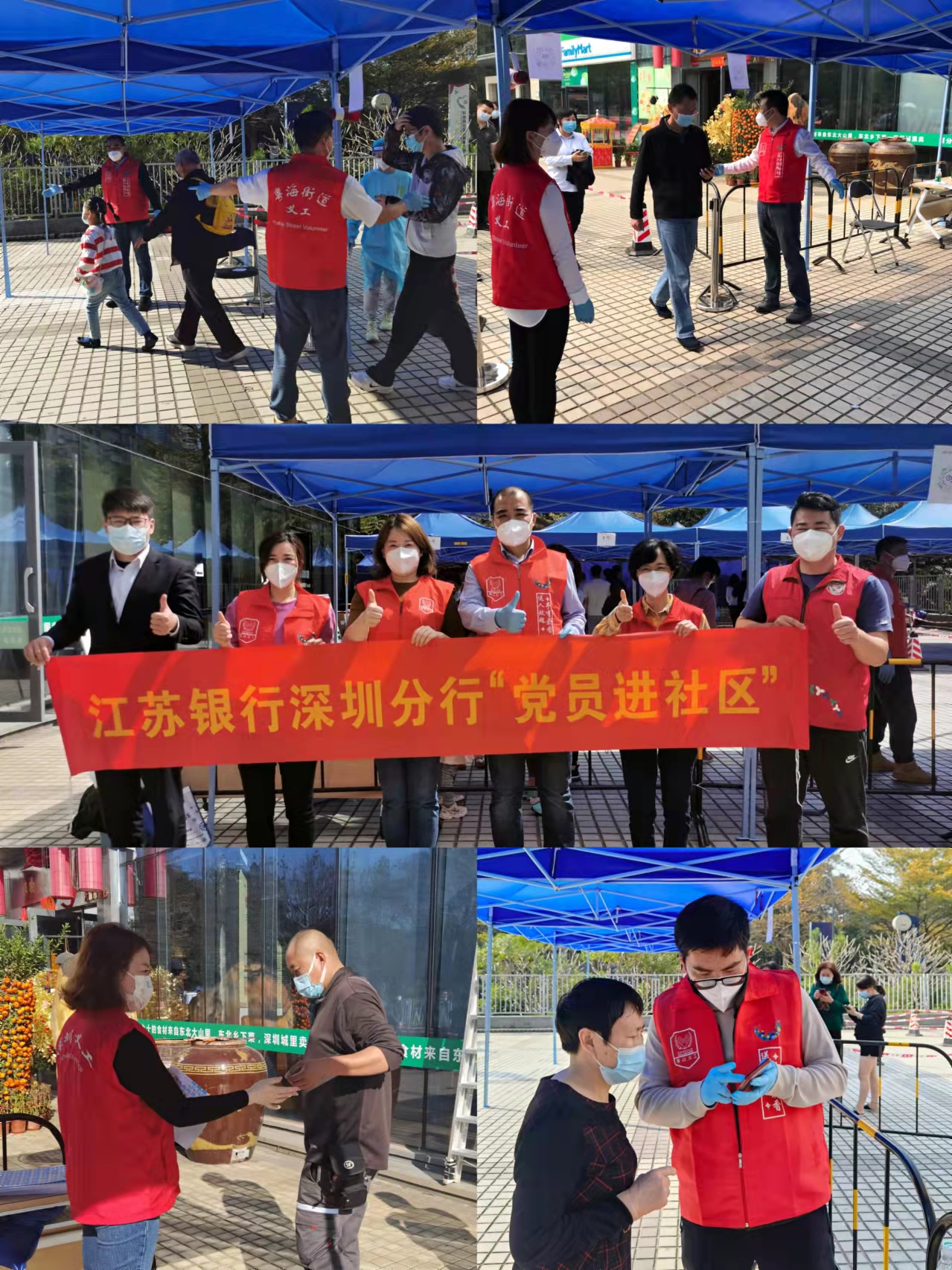 在該行黨委統(tǒng)一部署及有效組織下,江蘇銀行深圳分行營業(yè)部、福田支行、南山支行、前海支行等基層黨組織快速響應(yīng),立即組建起由黨支部書記、支行行長帶頭的志愿先鋒隊(duì)。2月中旬起,江蘇銀行深圳分行志愿先鋒隊(duì)忙碌在福田海濱社區(qū)、南山蔚藍(lán)海岸社區(qū)、高新區(qū)社區(qū)等多個核酸檢測點(diǎn),在核酸采樣現(xiàn)場提醒民眾查驗(yàn)健康碼、協(xié)助秩序維護(hù)、做好防疫宣傳、協(xié)助搬運(yùn)物資、進(jìn)行核酸引導(dǎo)、解答防疫問題。與社區(qū)醫(yī)護(hù)人員一起奮斗在抗疫第一線,用行動踐行初心,用汗水書寫擔(dān)當(dāng),用責(zé)任與堅守共筑抗疫“紅色防線”。