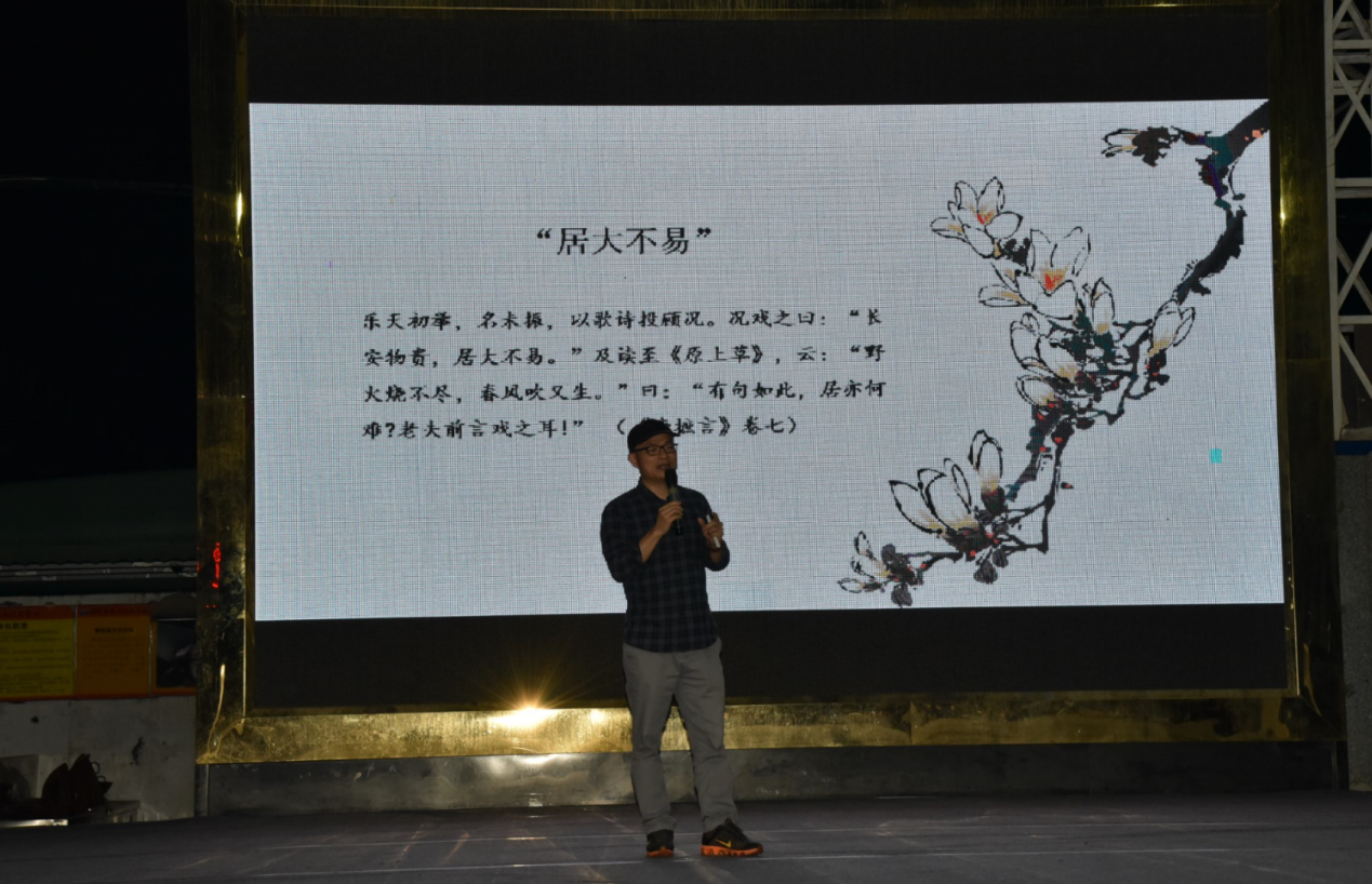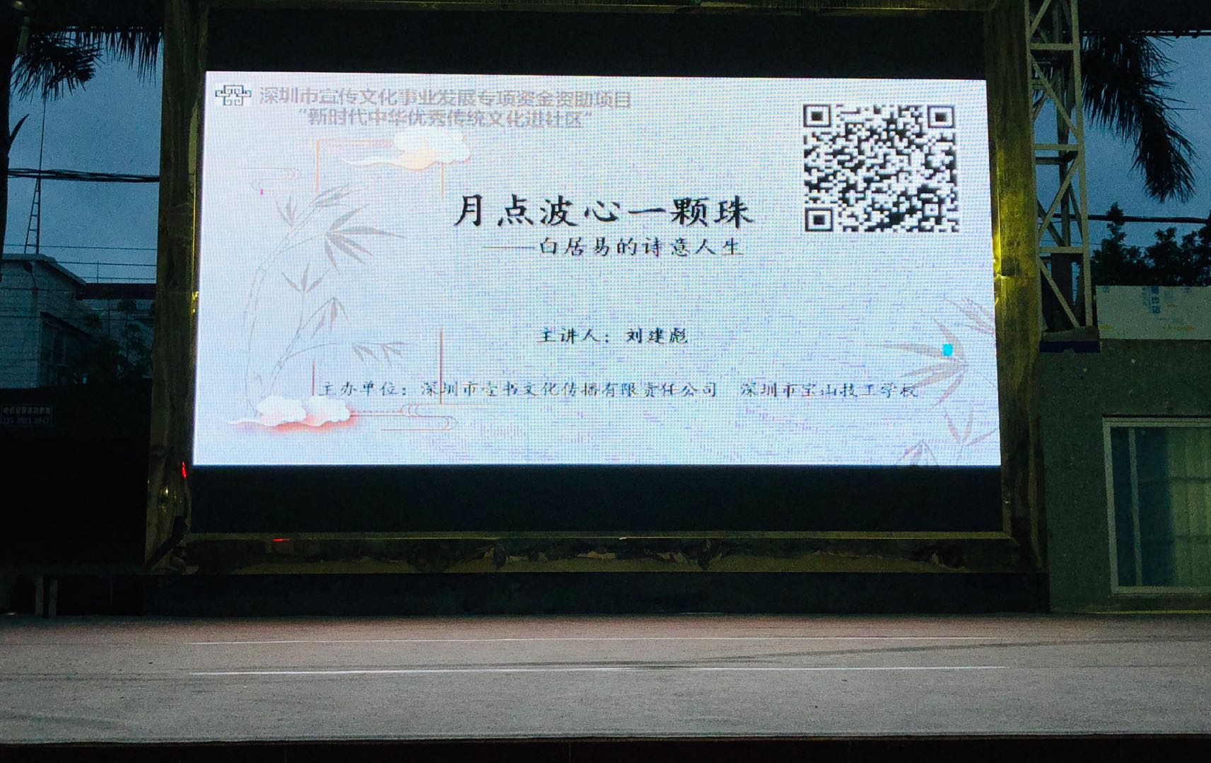 深圳新聞網(wǎng)訊 5月29日晚上,“新時代中華優(yōu)秀傳統(tǒng)文化進社區(qū)”系列活動第三場公益文化講座之“月點波心一顆珠——白居易的詩意人生”在深圳市寶山技工學(xué)校寶山大舞臺拉開帷幕,由愛詩家創(chuàng)始人劉建彪帶領(lǐng)聽眾一同走進“詩王”的詩意世界,感悟其至情至性。