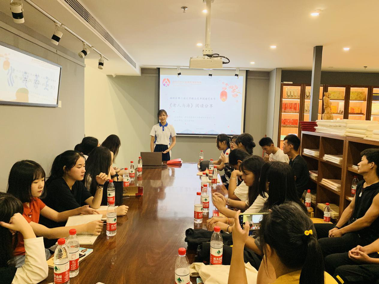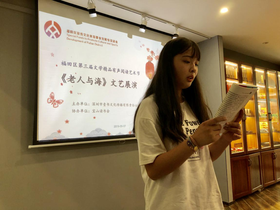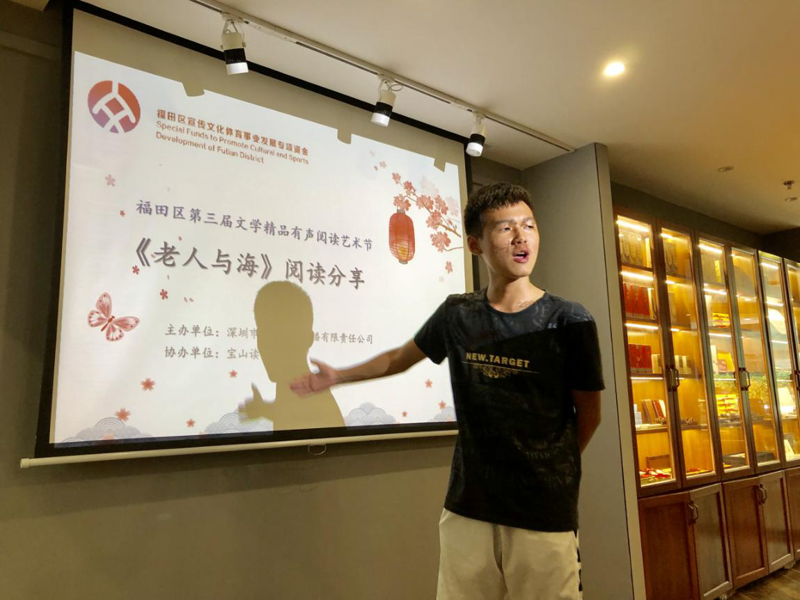 深圳新聞網(wǎng)訊 2019年9月7日,由深圳市壹書文化傳播有限責(zé)任公司主辦、寶山讀書會(huì)協(xié)辦的“福田區(qū)第三屆文學(xué)精品有聲閱讀藝術(shù)節(jié)”之《老人與?!烽喿x分享會(huì)暨文學(xué)作品朗誦會(huì)在簡(jiǎn)閱書吧香蜜湖店成功舉辦。來(lái)自深圳市寶山技工學(xué)校的學(xué)子們?cè)谥髦v人的啟示下分享閱讀感悟、誦讀精彩文摘,在文藝展演中體會(huì)圣地亞哥抗擊命運(yùn)的人生哲學(xué)。