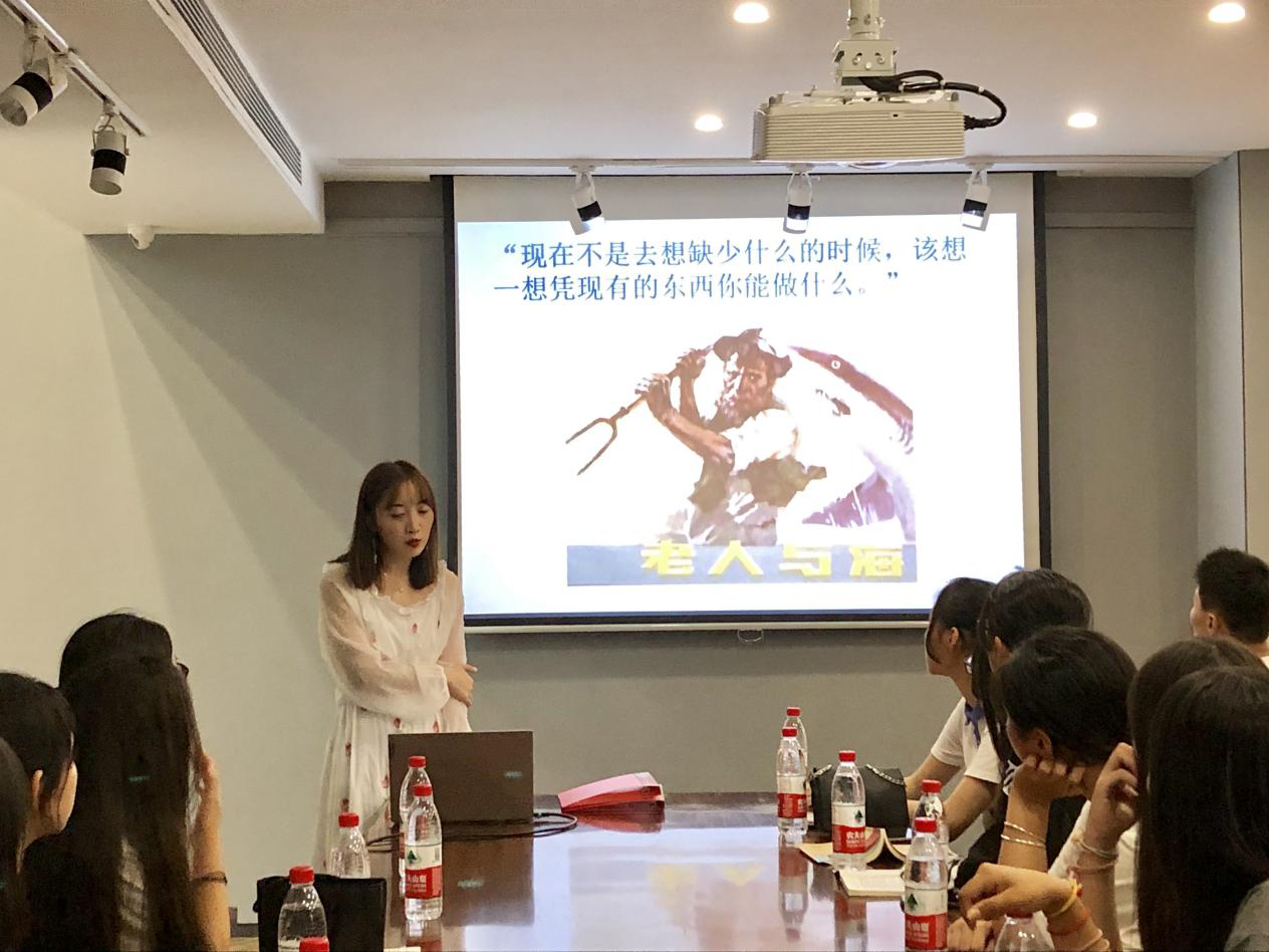 《老人與?!吠ㄟ^講述一個(gè)老漁夫的故事,揭示了人類共同的命運(yùn),給讀者帶來(lái)關(guān)于勇氣、不屈不撓、與命運(yùn)作斗爭(zhēng)的精神啟迪。圍繞“生而為人,請(qǐng)務(wù)必戰(zhàn)斗到底”這一主題,邵洋提出了“是選擇放棄,還是一往直前?”這一問題,引起在座同學(xué)的思考。隨后,她又通過解讀《老人與?!分械挠飨笈c藝術(shù)、生命與理想,為同學(xué)們總結(jié)值得學(xué)習(xí)的寫作思路。