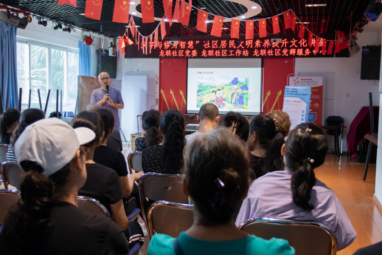 11月13日上午,本系列活動的第六場講座在龍聯(lián)社區(qū)工作站拉開了序幕。講座開始前,現(xiàn)場聽眾每人手上都拿到一本《深圳市民公約》小手冊和《漢字與修身智慧》學(xué)習(xí)資料,劉建彪老師首先跟大家互動:“我們需要什么樣的家園?文明城市從哪里開始?”“美麗、溫馨、文明、和諧的家園”,臺下一位叔叔的聲音尤其洪亮,劉老師及時肯定了他的回答。劉老師接著說,文明城市從人開始,人是建設(shè)文明城市的中堅力量,他進(jìn)一步補充道,做文明人的第一步是轉(zhuǎn)變思想,只有了解并認(rèn)同文明的重要性,才會自覺地踐行文明禮儀,積極參與城市文明的創(chuàng)建。