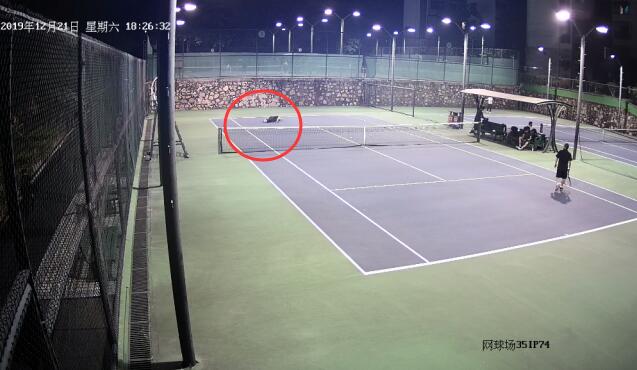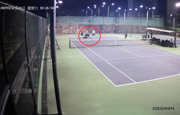圖:正在打網(wǎng)球的李老伯(遠(yuǎn)處倒地者)突然倒地失去意識。