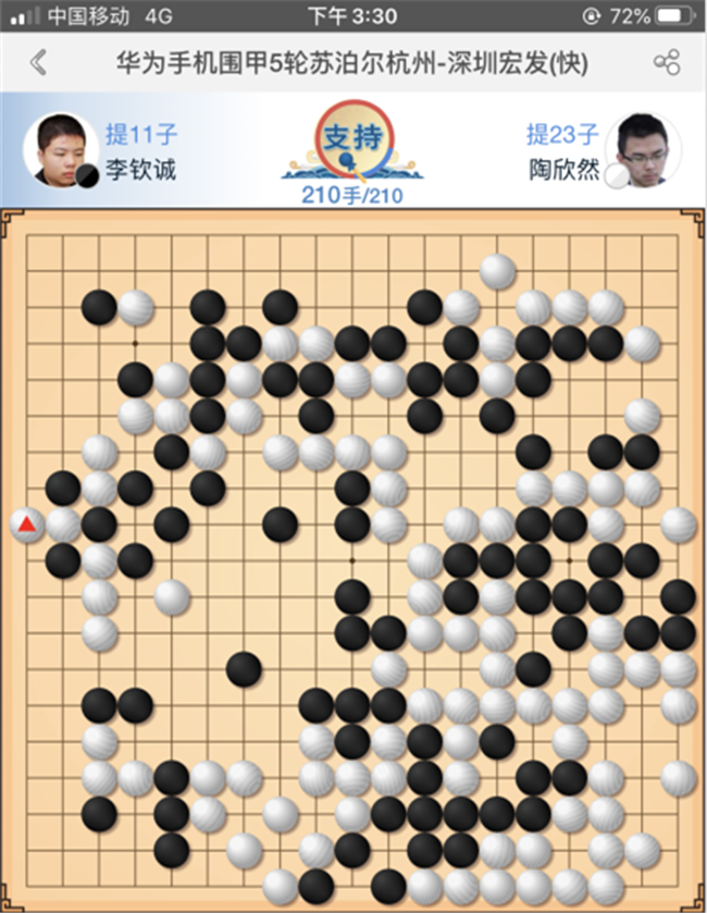 第三臺,快棋陶欣然執(zhí)白對陣李傾誠。中盤白棋打入右下黑棋模樣,黑棋應對連續(xù)失誤,損失慘重一無所獲遂認負。