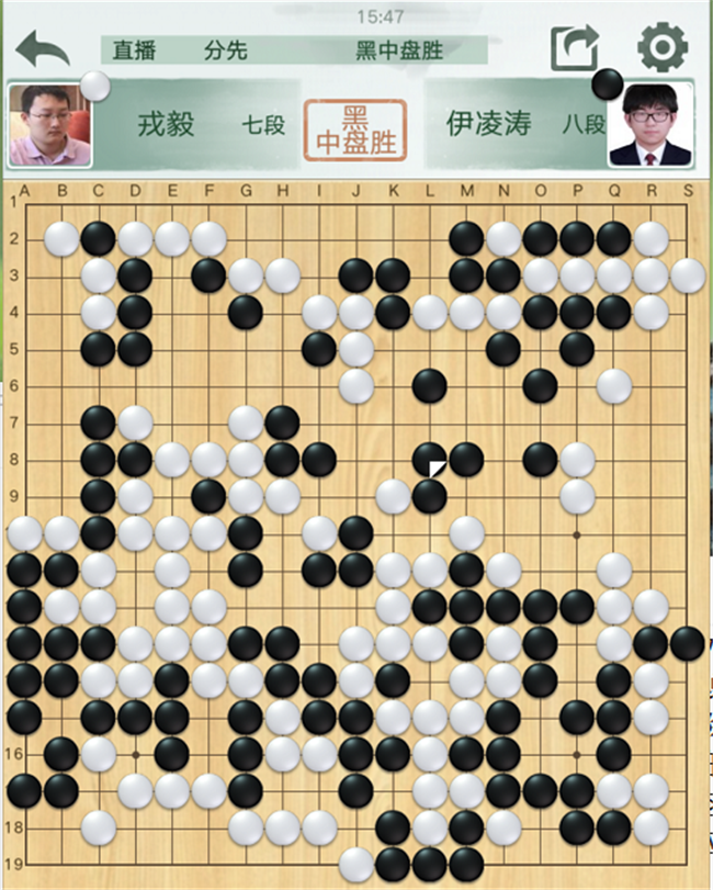 第三臺(tái),戎毅執(zhí)白對(duì)陣伊凌濤。開(kāi)局白棋不錯(cuò),左側(cè)沖擊黑棋薄弱處時(shí)候次序失誤,