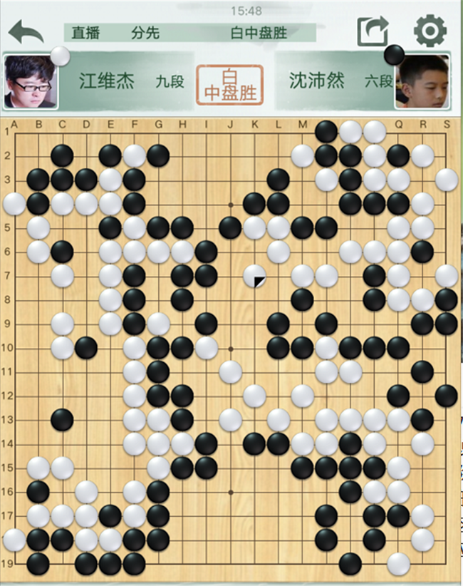 第四臺(tái),沈沛然執(zhí)黑對(duì)陣世界冠軍江維杰。黑開(kāi)局不利,右下角65緩手導(dǎo)致差距拉大。