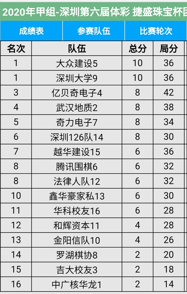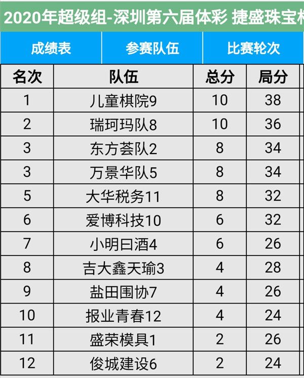 見(jiàn)圳客戶(hù)端?深圳新聞網(wǎng)2020年11月8日訊(記者周錦春)第六屆“體彩?捷盛珠寶杯”深圳市圍棋聯(lián)賽繼續(xù)在羅湖區(qū)藝嘉大酒店展開(kāi),今天是第二場(chǎng),有第4輪至第6輪的比賽。目前,超級(jí)組中,兒童棋院隊(duì)、瑞珂瑪隊(duì)領(lǐng)先;甲級(jí)組中,大眾建設(shè)、深圳大學(xué)領(lǐng)先。具體賽程結(jié)果請(qǐng)看本文附后表格。