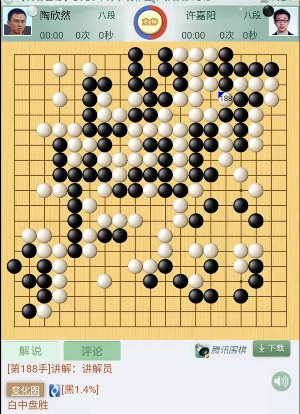 第一臺(tái)慢棋,由深圳隊(duì)的陶欣然八段執(zhí)白對陣江西隊(duì)的許嘉陽八段。雙方開局平穩(wěn),中盤黑棋侵消左邊白棋大模樣時(shí)行棋過分,遭到白棋反擊后黑棋較為危險(xiǎn)。隨即作戰(zhàn)形成對殺,白棋沒有下出簡明的快一氣變化,連續(xù)失誤后形成黑棋有利的劫爭。劫爭中黑棋卻出現(xiàn)嚴(yán)重失誤,由殺白變成了白棋便宜巨大的轉(zhuǎn)換,最終投子認(rèn)負(fù),陶欣然執(zhí)白中盤勝許嘉陽。