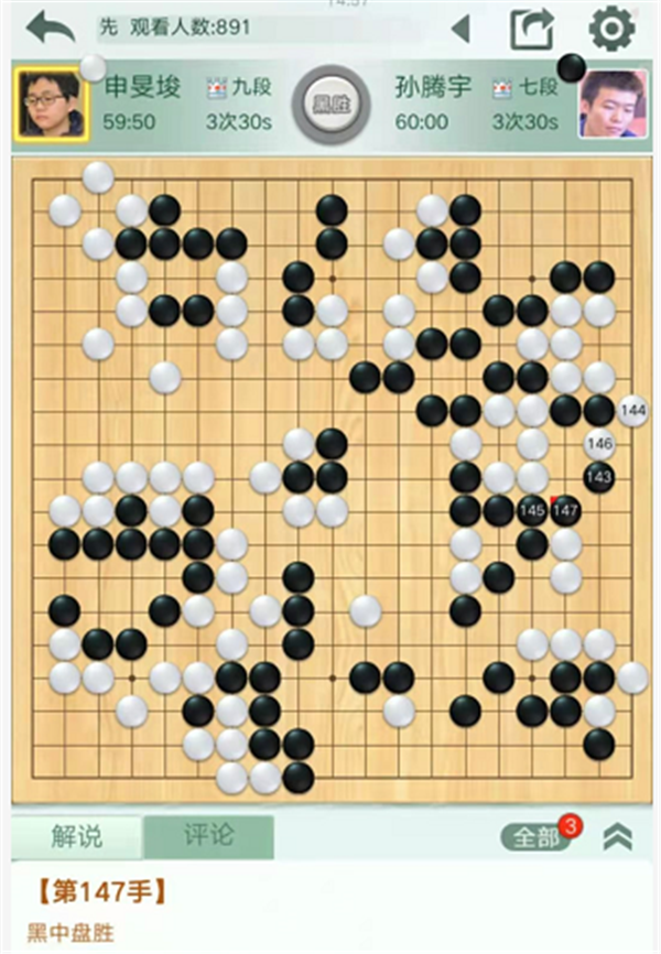 第一臺(tái)快棋,由深圳隊(duì)外援申旻埈九段執(zhí)白對(duì)陣民生隊(duì)的孫騰宇七段。白棋開局順暢,中盤下邊雙方小有失誤,依然白棋領(lǐng)先。之后白棋良好的掌握局面,優(yōu)勢擴(kuò)大。進(jìn)入官子,白棋沒有補(bǔ)掉隱患,進(jìn)入中央破黑空時(shí)較為沖動(dòng),選點(diǎn)失誤造成虧損。最后被黑右邊進(jìn)入白空后反殺白棋,申旻埈執(zhí)白中盤負(fù)孫騰宇。