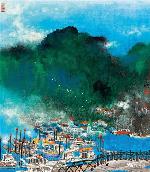 來自南京而定居于深圳的宋玉明,試圖將新金陵畫派表現(xiàn)現(xiàn)實的變革精神用于現(xiàn)代城市山水畫的探索上。作為新金陵畫派的第二代畫家,宋玉明直接承傳了宋文治表現(xiàn)現(xiàn)代太湖人居環(huán)境秀潤而精巧的家法,并將此種大山景加小民居的畫法轉(zhuǎn)用到深圳城市形態(tài)的表現(xiàn)上。這里,我們一方面可以看到深圳作為一個新興的現(xiàn)代城市借山而筑、注重自然環(huán)境在城市生態(tài)建設(shè)上的積極作用;另一方面,深圳這種與自然相統(tǒng)一的現(xiàn)代化城市建設(shè)理念,也為宋玉明進行城市山水畫創(chuàng)作提供了完美的表現(xiàn)對象。在《深圳文錦渡》等作品里,我們看到了畫家巧妙地將城市現(xiàn)代建筑與自然山水融為一體的表現(xiàn)。這些畫作,大多以勾線渲染的方法表現(xiàn)遠景中的商用或市政建筑設(shè)施,也因這些建筑被設(shè)置在中遠景,不僅減少了建筑塑造的困窘,而且突出了這些人居建筑與自然相得益彰的和諧關(guān)系。這些畫作,從嚴格的意義上說,仍然是山水畫,而宋式小散鋒皴以及云煙雨霧的渲染,也為畫面增添了幽深、恬靜、高雅、平和的意趣與境界。這些畫作,讓我們所熟悉的城市從一個相對遙遠的視角來觀看,既因距離產(chǎn)生了一種從未體驗過的美感,也較好地體現(xiàn)了現(xiàn)代城市與自然占位的協(xié)調(diào)統(tǒng)一、舒適宜居的比例關(guān)系。