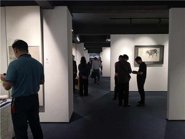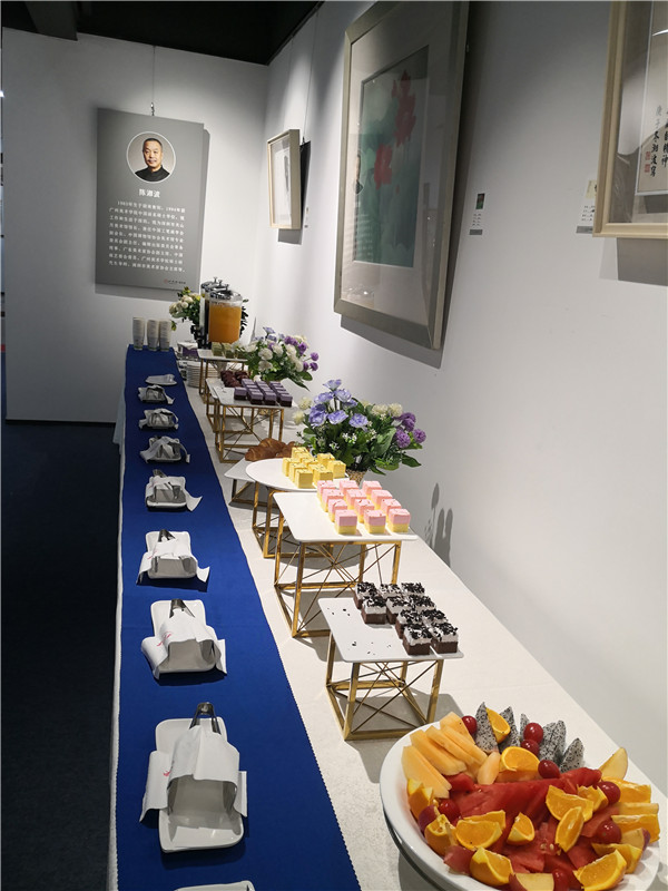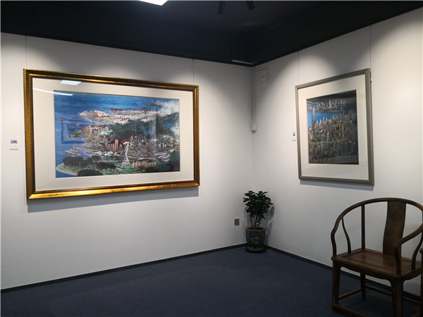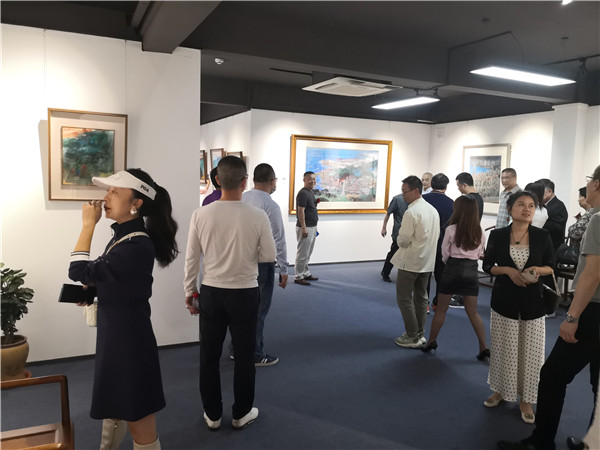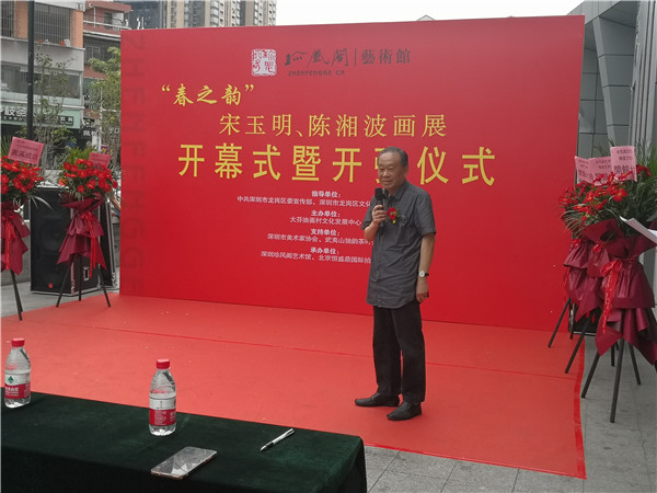 開幕儀式上,珍風閣藝術館總經(jīng)理夏雨致辭,感謝一從嘉賓和書畫愛好者們的捧場。隨后,深圳市美術家協(xié)會名譽主席、深圳美術館原館長宋玉明先生致辭。他說,他來大芬村多次,一直關注大芬油畫村的發(fā)展和壯大,認為大芬村為全國書畫走向市場開了先例。個人在此舉辦畫展是首次,感覺很有意義,是一次走向市場的實踐機會,值得珍惜和學習,也歡迎大家批評指正。在現(xiàn)場,宋玉明老師還回答了主持人的提問。他謙虛地說,這次和陳湘波主席的聯(lián)展,有陳主席的花鳥和自己的城市山水,可以雅俗共賞。陳湘波老師因參加“兩會”未能出席開幕儀式,但在會后及時趕到現(xiàn)場,表達自己對來賓的感謝和自己對本次畫展組織的重視和支持。