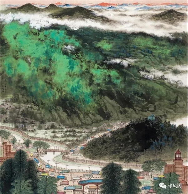 來自南京而定居于深圳的宋玉明,試圖將新金陵畫派表現(xiàn)現(xiàn)實的變革精神用于現(xiàn)代城市山水畫的探索上。作為新金陵畫派的第二代畫家,宋玉明直接承傳了宋文治表現(xiàn)現(xiàn)代太湖人居環(huán)境秀潤而精巧的家法,并將此種大山景加小民居的畫法轉用到深圳城市形態(tài)的表現(xiàn)上。這里,我們一方面可以看到深圳作為一個新興的現(xiàn)代城市借山而筑、注重自然環(huán)境在城市生態(tài)建設上的積極作用;另一方面,深圳這種與自然相統(tǒng)一的現(xiàn)代化城市建設理念,也為宋玉明進行城市山水畫創(chuàng)作提供了完美的表現(xiàn)對象。在《深圳文錦渡》等作品里,我們看到了畫家巧妙地將城市現(xiàn)代建筑與自然山水融為一體的表現(xiàn)。這些畫作,大多以勾線渲染的方法表現(xiàn)遠景中的商用或市政建筑設施,也因這些建筑被設置在中遠景,不僅減少了建筑塑造的困窘,而且突出了這些人居建筑與自然相得益彰的和諧關系。這些畫作,從嚴格的意義上說,仍然是山水畫,而宋式小散鋒皴以及云煙雨霧的渲染,也為畫面增添了幽深、恬靜、高雅、平和的意趣與境界。這些畫作,讓我們所熟悉的城市從一個相對遙遠的視角來觀看,既因距離產(chǎn)生了一種從未體驗過的美感,也較好地體現(xiàn)了現(xiàn)代城市與自然占位的協(xié)調(diào)統(tǒng)一、舒適宜居的比例關系。
