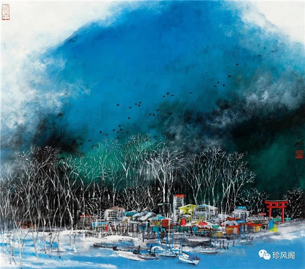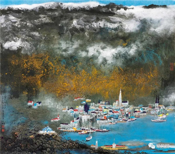 宋玉明從金陵畫派的新傳統(tǒng)跨越到城市表現(xiàn)的積彩拓墨畫法,既體現(xiàn)了現(xiàn)代化城市對于變革傳統(tǒng)的時代訴求,也體現(xiàn)了他移居深圳后這座新興城市文化對于他的深刻影響。畢竟,連續(xù)數(shù)屆的深圳水墨雙年展對于水墨在跨文化中重要作用與表現(xiàn)方法的突破,都給予他至深的思想開拓。這表明,城市山水畫已不單純是用中國畫表現(xiàn)城市的命題,而是其中能夠蘊含多少城市文化觀念與城市審美的方法,宋玉明對于城市山水畫的探索,體現(xiàn)的正是這樣一種對城市現(xiàn)代文化的思想融合性。而不拘謹于城市一磚一石、一街一道、一房一樓的描繪,著眼于發(fā)揮水墨與彩墨表現(xiàn)的自由性,抑或體現(xiàn)了人性、自然與現(xiàn)代城市共同作用的現(xiàn)代生活方式與人文理想。的確,純粹用中國畫或水墨畫來探索城市的現(xiàn)代化景觀表現(xiàn),也許只是淺層次的審美需求;而只有當把山水畫作為人與自然和諧統(tǒng)一的觀念表達植入城市現(xiàn)代化的審美訴求時,城市山水畫才能真正凸顯出其深刻的美學價值。這正是我們從宋玉明的作品里能夠讀解到的他對于城市山水畫審美理想的一種勾畫。