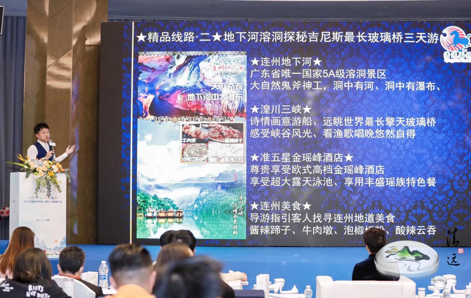 文化是旅游的靈魂,旅游是文化的載體。近年來,清遠(yuǎn)依托自然資源稟賦和深厚的文化底蘊(yùn),多措并舉推動(dòng)文旅融合發(fā)展,文旅產(chǎn)業(yè)呈現(xiàn)欣欣向榮局面?,F(xiàn)場(chǎng),清遠(yuǎn)市珠水美悅酒店管理有限公司總經(jīng)理宋玉亮、清遠(yuǎn)市古龍峽生態(tài)旅游娛樂有限公司營(yíng)銷專員林嘉儀、清遠(yuǎn)市愛地旅游發(fā)展有限公司營(yíng)銷經(jīng)理?xiàng)钍婧?、清遠(yuǎn)市國(guó)業(yè)旅游開發(fā)有限公司常務(wù)副總經(jīng)理韓勇,依次以圖文并茂、聲畫結(jié)合的形式,推介了美林湖景區(qū),古龍峽景區(qū),連州地下河、湟川三峽、龍?zhí)犊蜅?、擎天玻璃橋、連州大酒店,峰林曉鎮(zhèn)、洞天仙境,讓與會(huì)人員身臨其境感受山水清遠(yuǎn)的魅力;清遠(yuǎn)市國(guó)旅國(guó)際旅行社有限責(zé)任公司業(yè)務(wù)總監(jiān)李國(guó)華則現(xiàn)場(chǎng)推介了古龍峽云天玻霸兩天游、地下河溶洞探秘及吉尼斯最長(zhǎng)玻璃橋三天游等5條精品旅游線路,現(xiàn)場(chǎng)“種草”清遠(yuǎn)眾多網(wǎng)紅打卡點(diǎn)。