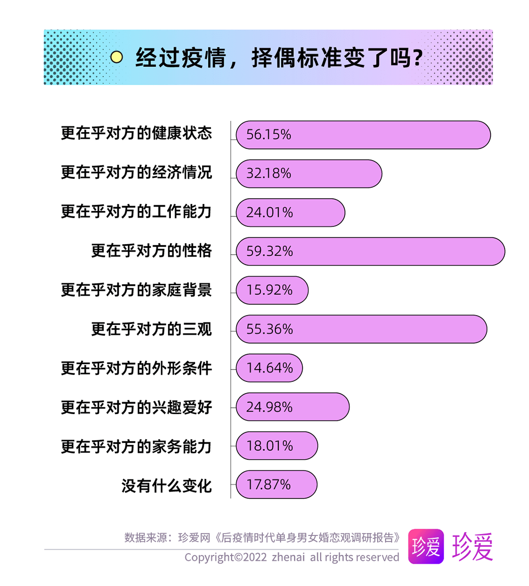 人們的生活方式和心態(tài)因疫情影響有或多或少的改變,而單身青年們的擇偶標(biāo)準(zhǔn)也在發(fā)生著變化,調(diào)查顯示,經(jīng)歷過疫情,單身青年們更在乎的擇偶條件包括對方的性格(59.32%)、健康狀態(tài)(56.15%)和三觀(55.36%),對方的經(jīng)濟(jì)情況、興趣愛好、工作能力以及家務(wù)能力也是考量的重要標(biāo)準(zhǔn)。