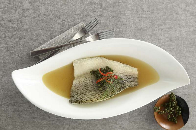 區(qū)別于充斥著辣椒與熱油的傳統(tǒng)水煮魚,梧桐 PLUS 的 fusion水煮魚外表清新,口感麻辣。食材選用三斤左右的上等淡水鱸魚,清晨宰殺,剔骨后整場取肉,再經過高溫蒸制,保證魚肉肉質嫩滑松軟。并不像傳統(tǒng)的水煮魚采用的“湯菜”的方式,fusion水煮魚采用肉料分離的烹飪方式。魚湯經過麻椒、辣椒的熬煮而變得味道濃郁,過濾后僅留清爽的湯汁,單從視覺上根本無法判斷蘊藏的奇妙味道,這也正是這道招牌菜的精妙之處。盛盤后的fusion 水煮魚猶如一道藝術品,造型簡約充滿意境,清亮的魚湯入口瞬間酸辣感通透口腔,脫離了紅油浸泡的濃郁麻辣口感,更加健康養(yǎng)生。