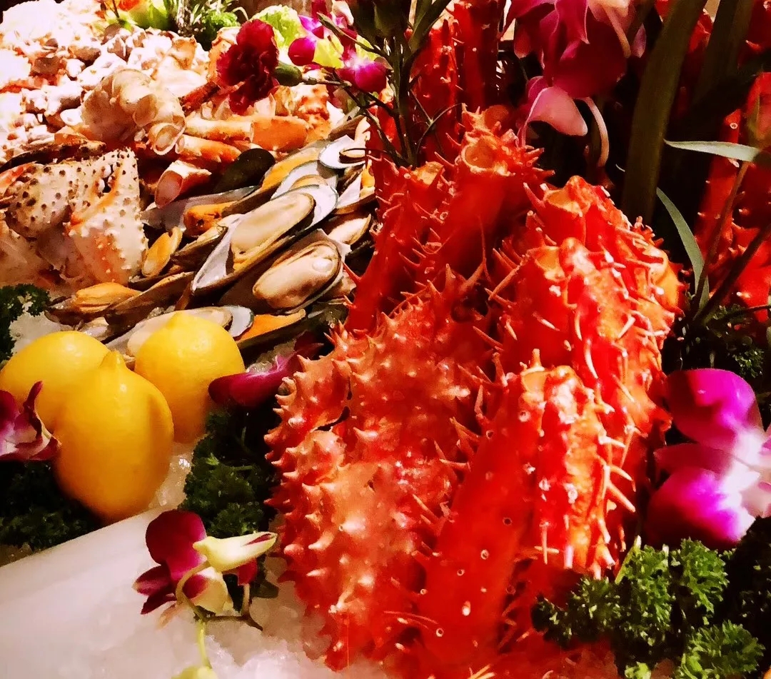 吃生猛龍蝦、阿拉斯加蟹腳、九節(jié)蝦、三文魚(yú)刺身