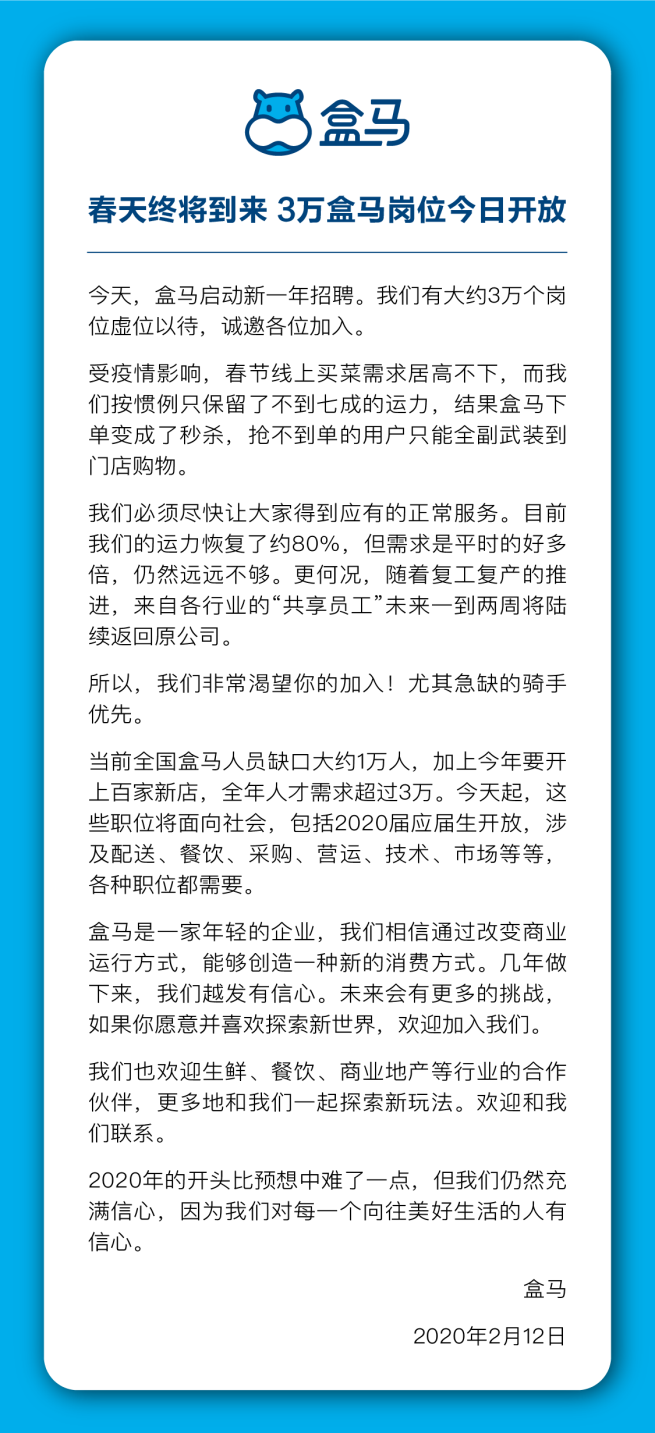 見圳客戶端·深圳新聞網(wǎng)2020年2月12日訊 2月12日,盒馬宣布開啟新一輪招聘,開放3萬個(gè)崗位,包括總部采購(gòu)、技術(shù)、運(yùn)營(yíng)等,也包括一線門店小二,其中配送小哥最為緊急。