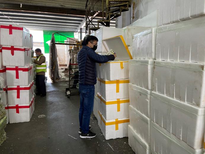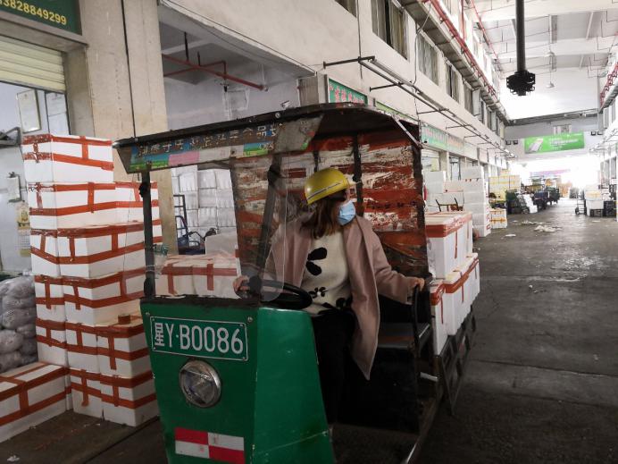 市場的檔主、物流車司機(jī)、加工工人,全部都帶上口罩,看新聞講跟人講話要保持距離,但忙起來真顧不了那么多,大家都在“搶貨”,這頭跟檔主商量好,那頭貨可能被拉走了?!柏浺阶约旱募庸ぶ行?,才算是你的?!币?yàn)榇汗?jié)批發(fā)市場的檔口工人回去一大半了,沒人送貨,緊張的時(shí)候,有女同事干脆自己借一輛三輪車,把談好的貨源直接拉走。